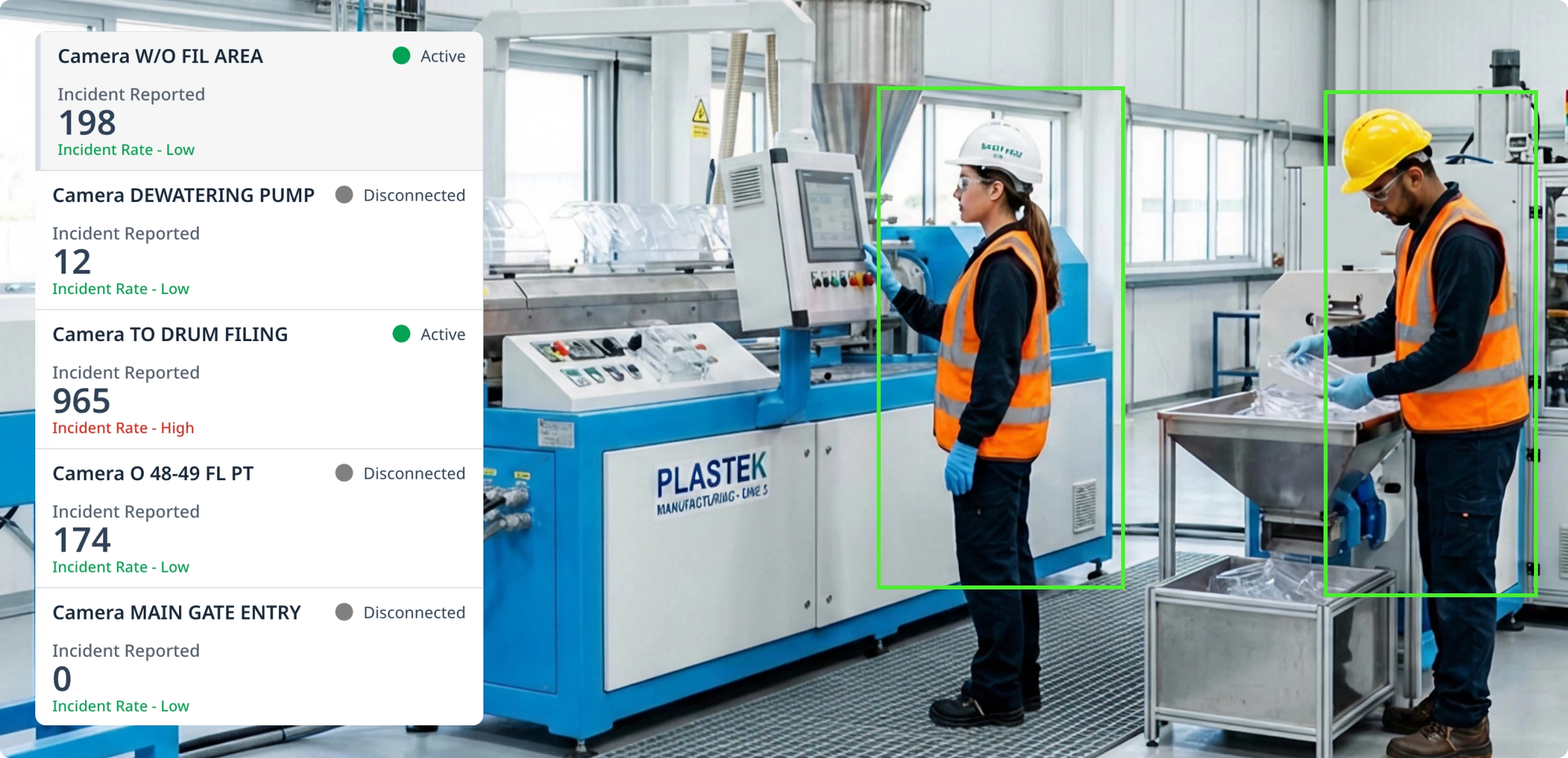 Automated detection of PPE (Helmets/Vests), Forklift Overspeeding, and pedestrian proximity across production and material handling areas